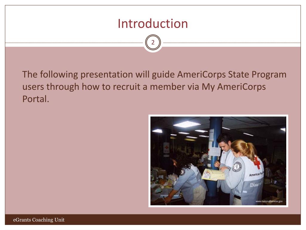 Introduction The following presentation will guide AmeriCorps State Program users through how to recruit a member via My AmeriCorps Portal. eGrants Coaching Unit