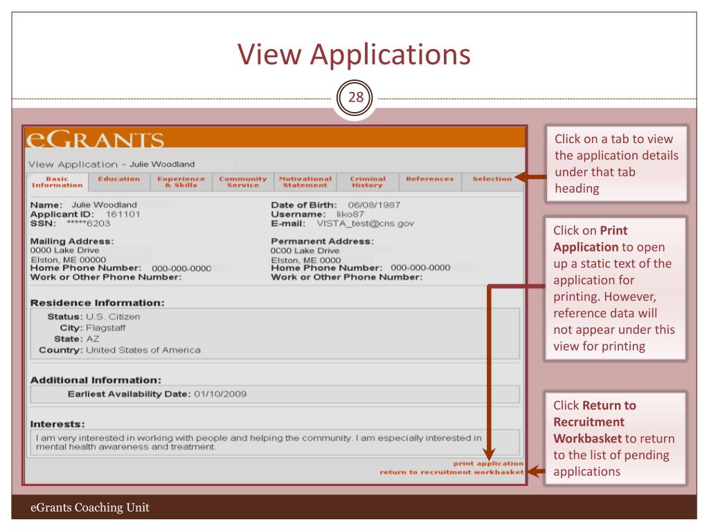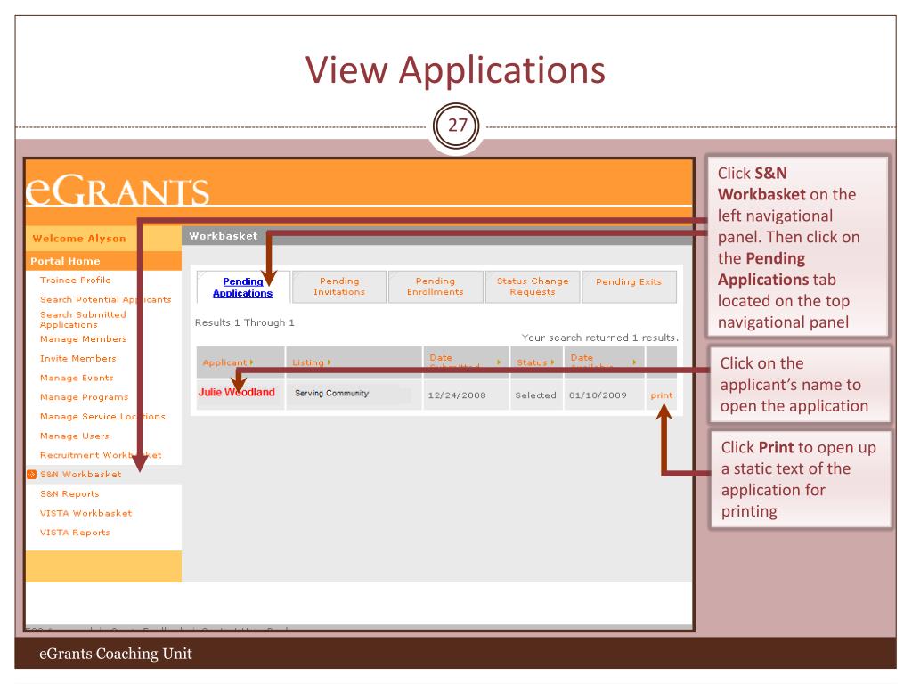 Submitted Applications Search 26 Click on the page numbers to scroll through your search results Click on the arrow next to a column heading (Name, Applicant ID, etc.) to arrange the list in an ascending order under that column heading Click on an applicant’s name to view his/her application eGrants Coaching Unit