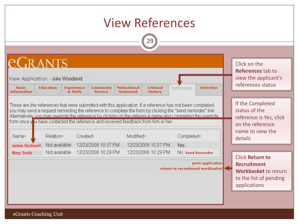 View References 29 Click on the References tab to view the applicant’s references status If the Completed status of the reference is Yes, click on the reference name to view the details Click Return to Recruitment Workbasket to return to the list of pending applications eGrants Coaching Unit