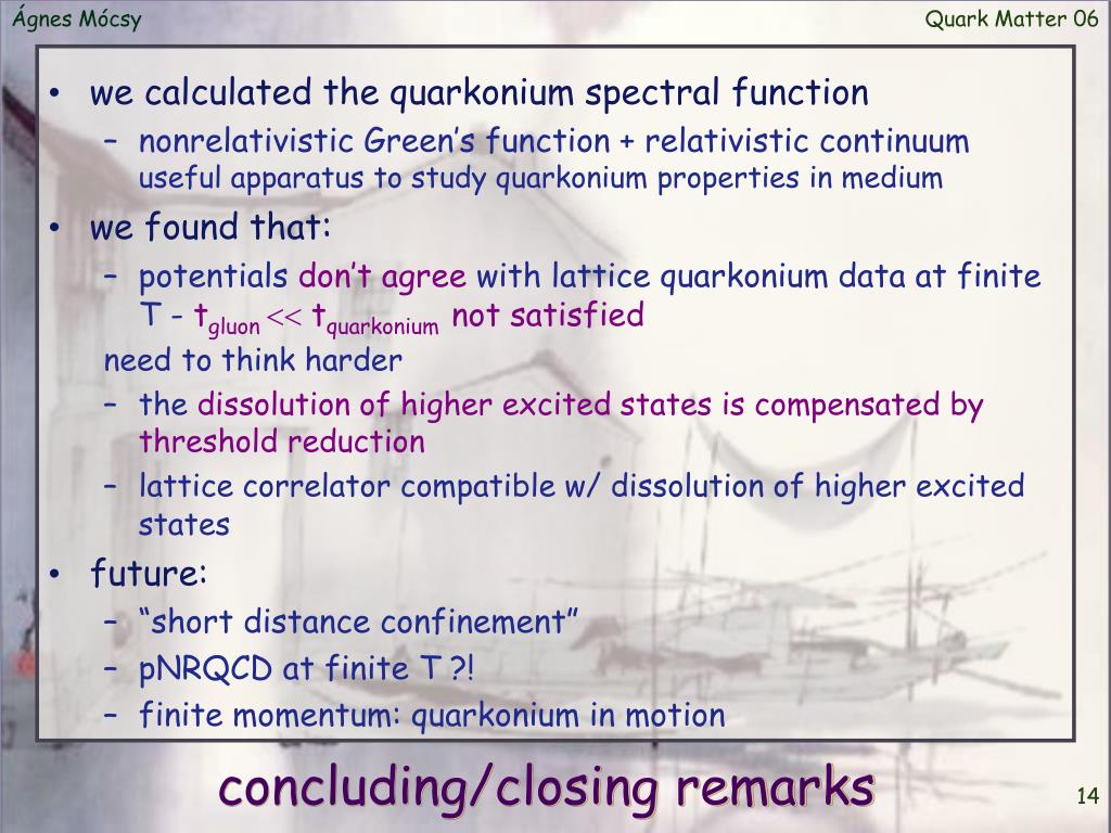 Quark Matter 06 • we calculated the quarkonium spectral function • nonrelativistic Green’s function + relativistic continuum useful apparatus to study quarkonium properties in medium • we found that: • potentials don’t agree with lattice quarkonium data at finite T - tgluon tquarkoniumnot satisfied need to think harder • the dissolution of higher excited states is compensated by threshold reduction • lattice correlator compatible w/ dissolution of higher excited states • future: • “short distance confinement” • pNRQCD at finite T ?! • finite momentum: quarkonium in motion concluding/closing remarks