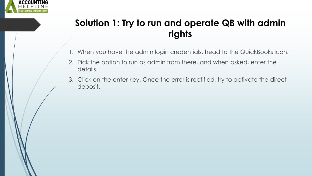 Solution 1: Try to run and operate QB with admin rights • When you have the admin login credentials, head to the QuickBooks icon. • Pick the option to run as admin from there, and when asked, enter the details. • Click on the enter key. Once the error is rectified, try to activate the direct deposit.