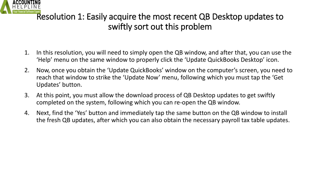 4. Resolution 1: Easily acquire the most recent QB Desktop updates to swiftly sort out this problem • In this resolution, you will need to simply open the QB window, and after that, you can use the ‘Help’ menu on the same window to properly click the ‘Update QuickBooks Desktop’ icon. • Now, once you obtain the ‘Update QuickBooks’ window on the computer’s screen, you need to reach that window to strike the ‘Update Now’ menu, following which you must tap the ‘Get Updates’ button. • At this point, you must allow the download process of QB Desktop updates to get swiftly completed on the system, following which you can re-open the QB window. • Next, find the ‘Yes’ button and immediately tap the same button on the QB window to install the fresh QB updates, after which you can also obtain the necessary payroll tax table updates.