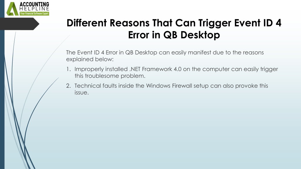 2. Different Reasons That Can Trigger Event ID 4 Error in QB Desktop The Event ID 4 Error in QB Desktop can easily manifest due to the reasons explained below: • Improperly installed .NET Framework 4.0 on the computer can easily trigger this troublesome problem. • Technical faults inside the Windows Firewall setup can also provoke this issue.