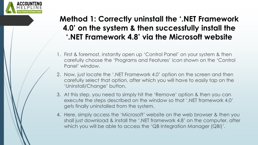 4. Method 1: Correctly uninstall the ‘.NET Framework 4.0’ on the system & then successfully install the ‘.NET Framework 4.8’ via the Microsoft website • First & foremost, instantly open up ‘Control Panel’ on your system & then carefully choose the ‘Programs and Features’ icon shown on the ‘Control Panel’ window. • Now, just locate the ‘.NET Framework 4.0’ option on the screen and then carefully select that option, after which you will have to easily tap on the ‘Uninstall/Change’ button. • At this step, you need to simply hit the ‘Remove’ option & then you can execute the steps described on the window so that ‘.NET framework 4.0’ gets finally uninstalled from the system. • Here, simply access the ‘Microsoft’ website on the web browser & then you shall just download & install the ‘.NET framework 4.8’ on the computer, after which you will be able to access the ‘QB Integration Manager (QBI)’.