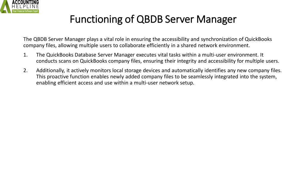 Functioning of QBDB Server Manager Functioning of QBDB Server Manager The QBDB Server Manager plays a vital role in ensuring the accessibility and synchronization of QuickBooks company files, allowing multiple users to collaborate efficiently in a shared network environment. 1. The QuickBooks Database Server Manager executes vital tasks within a multi-user environment. It conducts scans on QuickBooks company files, ensuring their integrity and accessibility for multiple users. 2. Additionally, it actively monitors local storage devices and automatically identifies any new company files. This proactive function enables newly added company files to be seamlessly integrated into the system, enabling efficient access and use within a multi-user network setup.
