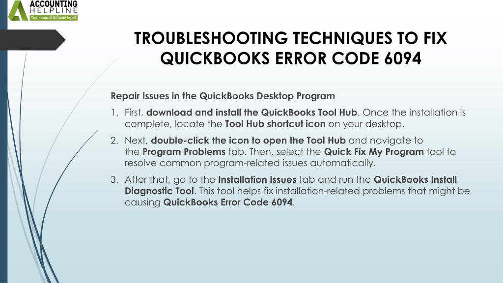 Troubleshooting Techniques To Fix QuickBooks Error Code 6094 Repair Issues in the QuickBooks Desktop Program • First, download and install the QuickBooks Tool Hub. Once the installation is complete, locate the Tool Hub shortcut icon on your desktop. • Next, double-click the icon to open the Tool Hub and navigate to the Program Problems tab. Then, select the Quick Fix My Program tool to resolve common program-related issues automatically. • After that, go to the Installation Issues tab and run the QuickBooks Install Diagnostic Tool. This tool helps fix installation-related problems that might be causing QuickBooks Error Code 6094.