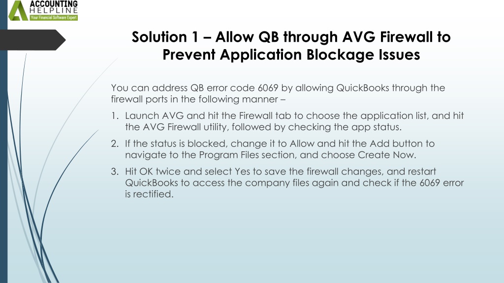 Solution 1 – Allow QB through AVG Firewall to Prevent Application Blockage Issues You can address QB error code 6069 by allowing QuickBooks through the firewall ports in the following manner – • Launch AVG and hit the Firewall tab to choose the application list, and hit the AVG Firewall utility, followed by checking the app status. • If the status is blocked, change it to Allow and hit the Add button to navigate to the Program Files section, and choose Create Now. • Hit OK twice and select Yes to save the firewall changes, and restart QuickBooks to access the company files again and check if the 6069 error is rectified.