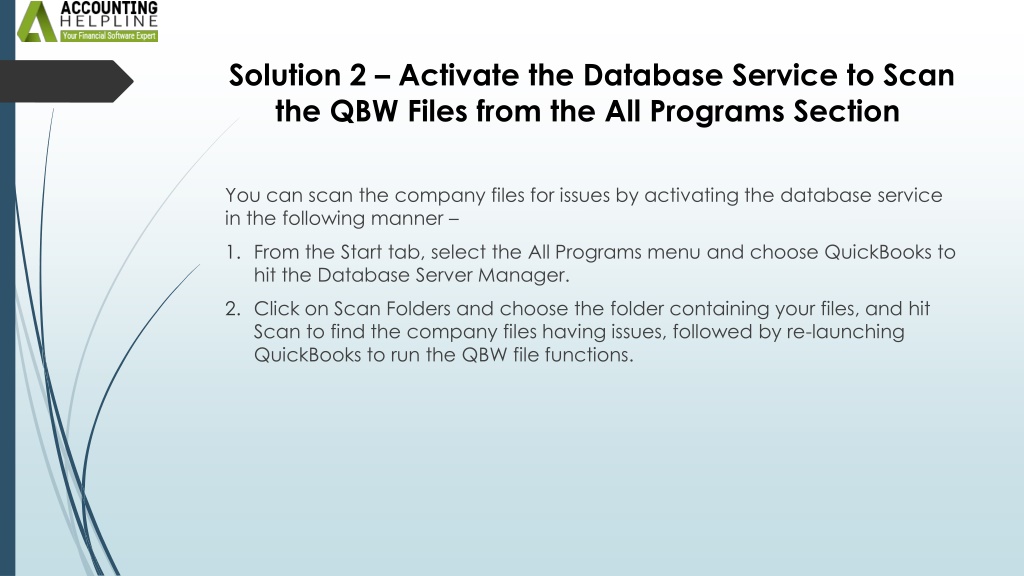 Solution 2 – Activate the Database Service to Scan the QBW Files from the All Programs Section You can scan the company files for issues by activating the database service in the following manner – • From the Start tab, select the All Programs menu and choose QuickBooks to hit the Database Server Manager. • Click on Scan Folders and choose the folder containing your files, and hit Scan to find the company files having issues, followed by re-launching QuickBooks to run the QBW file functions.
