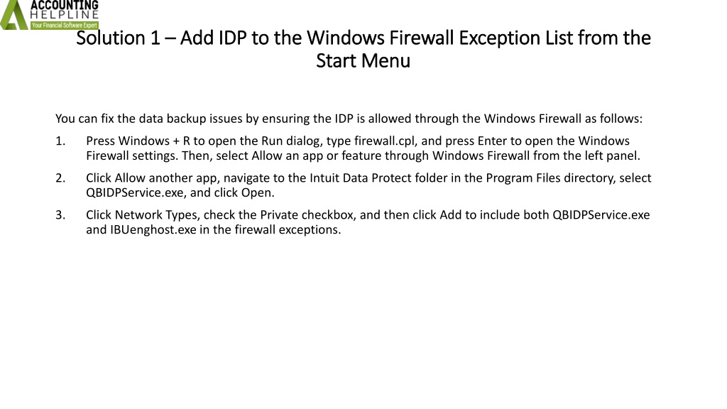 4. Solution 1 – Add IDP to the Windows Firewall Exception List from the Start Menu You can fix the data backup issues by ensuring the IDP is allowed through the Windows Firewall as follows: • Press Windows + R to open the Run dialog, type firewall.cpl, and press Enter to open the Windows Firewall settings. Then, select Allow an app or feature through Windows Firewall from the left panel. • Click Allow another app, navigate to the Intuit Data Protect folder in the Program Files directory, select QBIDPService.exe, and click Open. • Click Network Types, check the Private checkbox, and then click Add to include both QBIDPService.exe and IBUenghost.exe in the firewall exceptions.