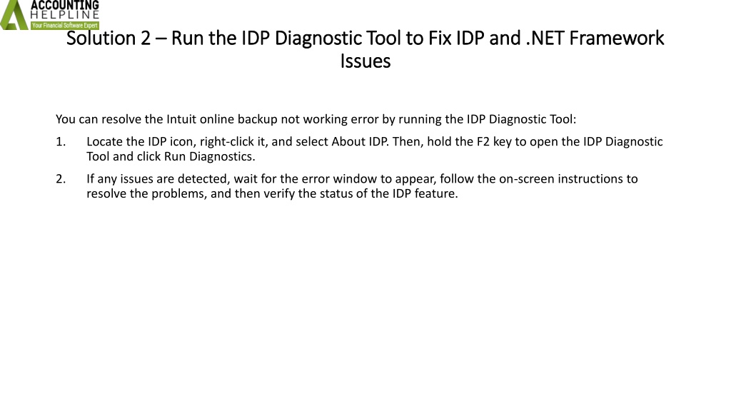 5. Solution 2 – Run the IDP Diagnostic Tool to Fix IDP and .NET Framework Issues You can resolve the Intuit online backup not working error by running the IDP Diagnostic Tool: • Locate the IDP icon, right-click it, and select About IDP. Then, hold the F2 key to open the IDP Diagnostic Tool and click Run Diagnostics. • If any issues are detected, wait for the error window to appear, follow the on-screen instructions to resolve the problems, and then verify the status of the IDP feature.