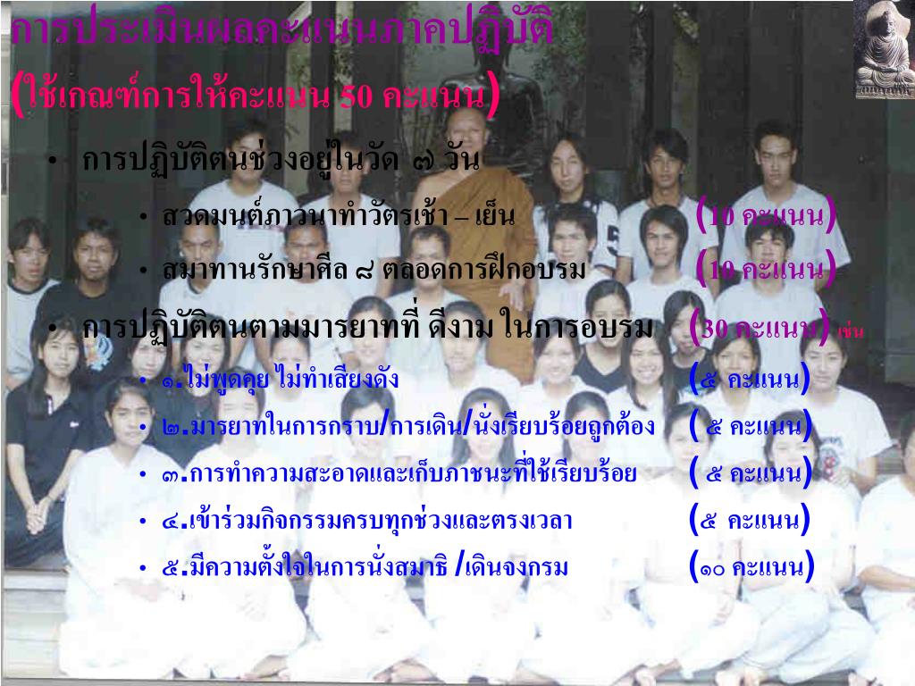 การประเมินผลคะแนนภาคปฏิบัติ(ใช้เกณฑ์การให้คะแนน 50 คะแนน) • การปฏิบัติตนช่วงอยู่ในวัด ๗ วัน • สวดมนต์ภาวนาทำวัตรเช้า – เย็น (10 คะแนน) • สมาทานรักษาศีล ๘ ตลอดการฝึกอบรม (10 คะแนน) • การปฏิบัติตนตามมารยาทที่ ดีงาม ในการอบรม (30 คะแนน)เช่น • ๑.ไม่พูดคุย ไม่ทำเสียงดัง (๕ คะแนน) • ๒.มารยาทในการกราบ/การเดิน/นั่งเรียบร้อยถูกต้อง (๕ คะแนน) • ๓.การทำความสะอาดและเก็บภาชนะที่ใช้เรียบร้อย (๕ คะแนน) • ๔.เข้าร่วมกิจกรรมครบทุกช่วงและตรงเวลา (๕ คะแนน) • ๕.มีความตั้งใจในการนั่งสมาธิ /เดินจงกรม (๑๐ คะแนน)