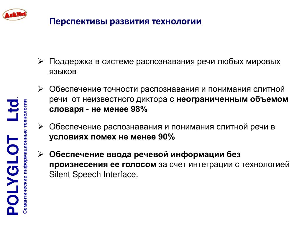 Перспективы развития технологии • Поддержка в системе распознавания речи любых мировых языков • Обеспечение точности распознавания и понимания слитной речи от неизвестного диктора с неограниченным объемом словаря -не менее 98% • Обеспечение распознавания и понимания слитной речи в условиях помех не менее 90% • Обеспечение ввода речевой информации без произнесения ее голосом за счет интеграции с технологией Silent Speech Interface. POLYGLOT Ltd. Семантические информационные технологии