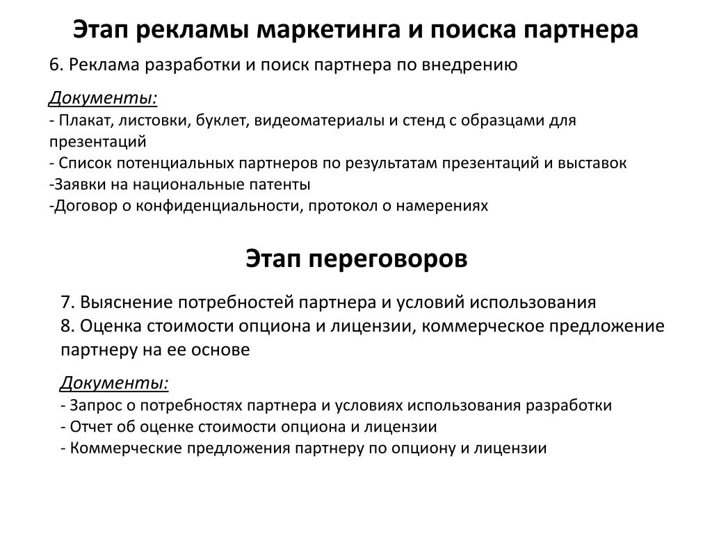 Этап рекламы маркетинга и поиска партнера • 6. Реклама разработки и поиск партнера по внедрению • Документы: • - Плакат, листовки, буклет, видеоматериалы и стенд с образцами для презентаций • - Список потенциальных партнеров по результатам презентаций и выставок • Заявки на национальные патенты • Договор о конфиденциальности, протокол о намерениях Этап переговоров 7. Выяснение потребностей партнера и условий использования 8. Оценка стоимости опциона и лицензии, коммерческое предложение партнеру на ее основе Документы: - Запрос о потребностях партнера и условиях использования разработки - Отчет об оценке стоимости опциона и лицензии - Коммерческие предложения партнеру по опциону и лицензии
