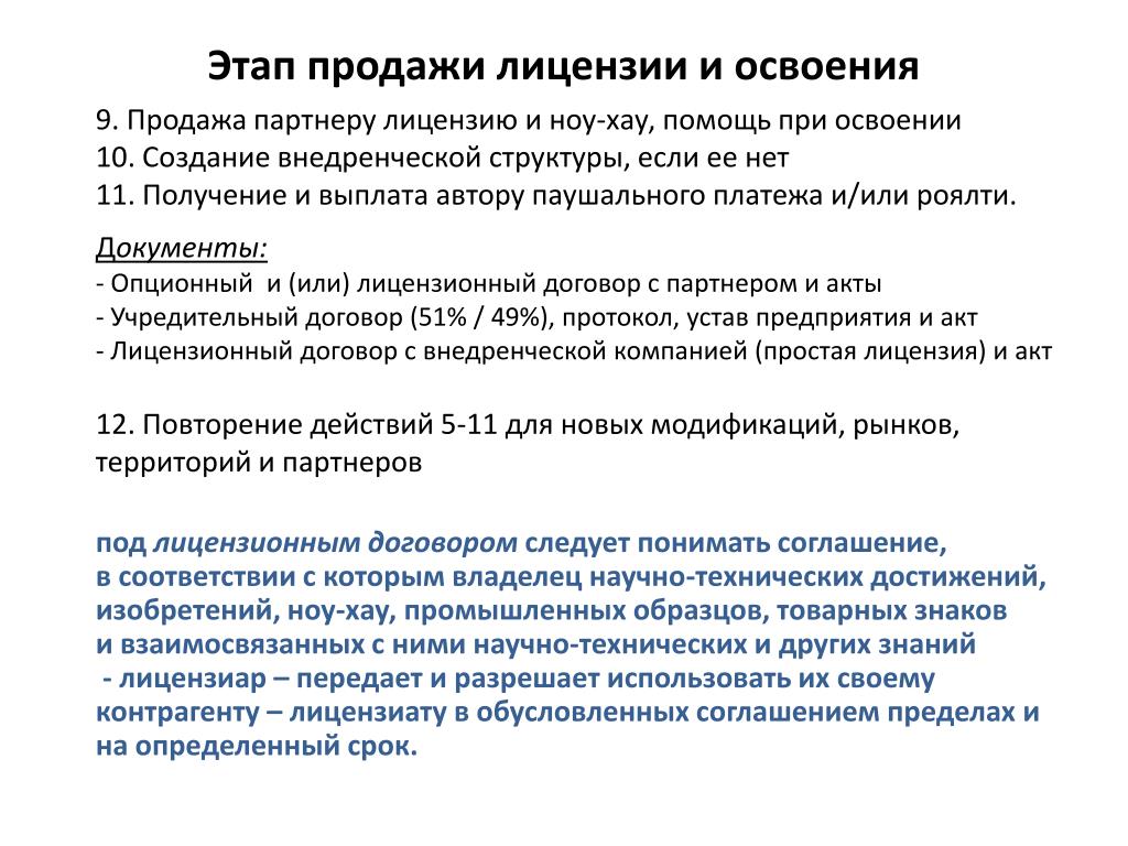 Этап продажи лицензии и освоения 9. Продажа партнеру лицензию и ноу-хау, помощь при освоении 10. Создание внедренческой структуры, если ее нет 11. Получение и выплата автору паушального платежа и/или роялти. Документы: - Опционный и (или) лицензионный договор с партнером и акты - Учредительный договор (51% / 49%), протокол, устав предприятия и акт - Лицензионный договор с внедренческой компанией (простая лицензия) и акт 12. Повторение действий 5-11 для новых модификаций, рынков, территорий и партнеров под лицензионным договором следует понимать соглашение, в соответствии с которым владелец научно-технических достижений, изобретений, ноу-хау, промышленных образцов, товарных знаков и взаимосвязанных с ними научно-технических и других знаний - лицензиар – передает и разрешает использовать их своему контрагенту – лицензиату в обусловленных соглашением пределах и на определенный срок.