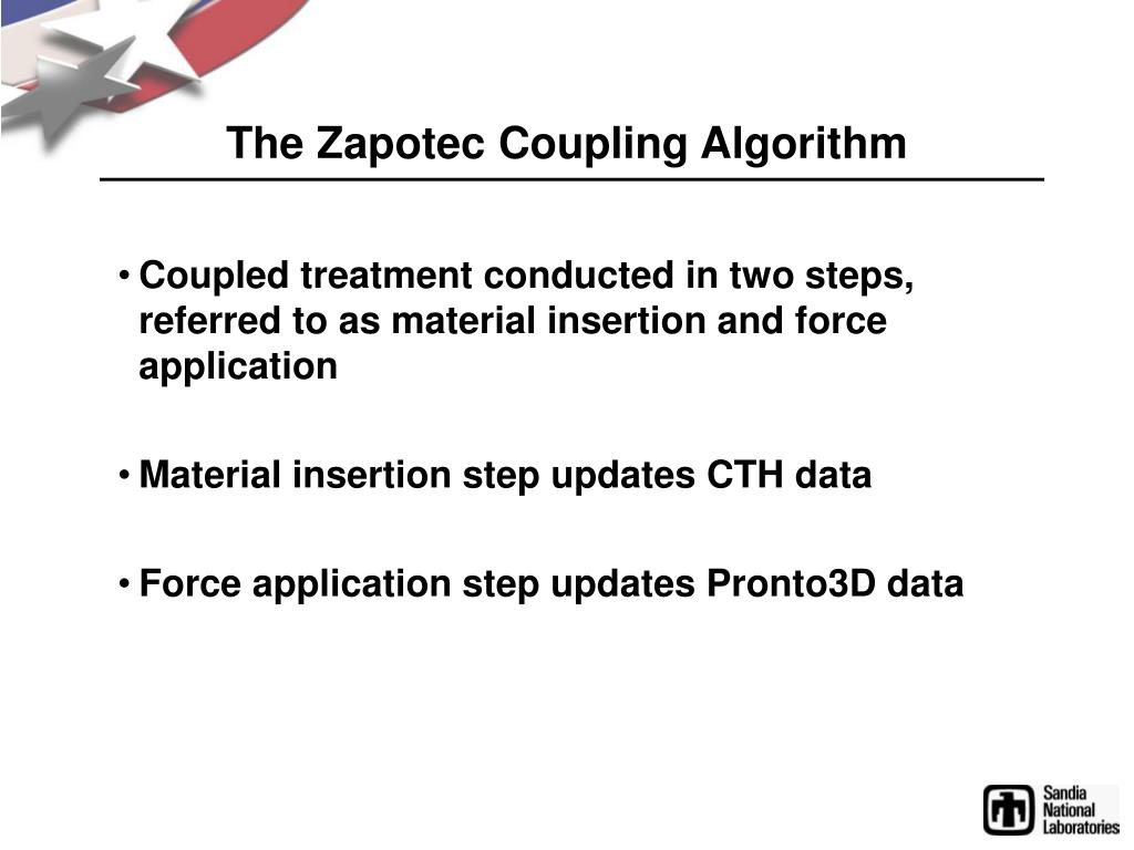 The Zapotec Coupling Algorithm • Coupled treatment conducted in two steps, referred to as material insertion and force application • Material insertion step updates CTH data • Force application step updates Pronto3D data