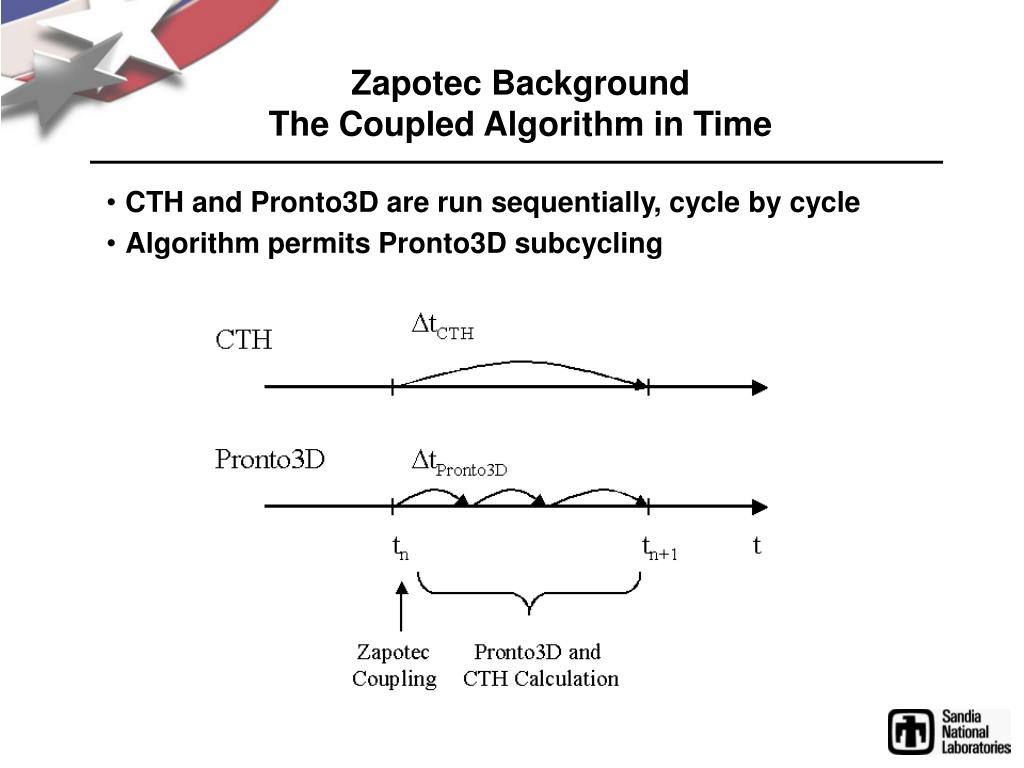 Zapotec Background The Coupled Algorithm in Time • CTH and Pronto3D are run sequentially, cycle by cycle • Algorithm permits Pronto3D subcycling