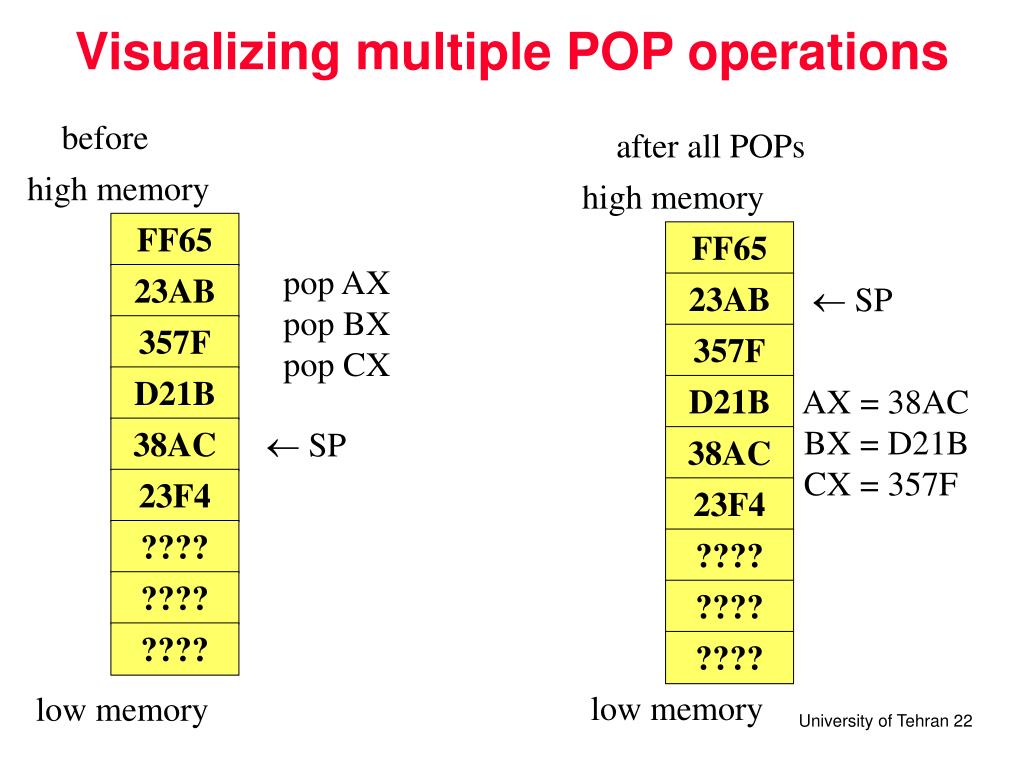 Visualizing multiple POP operations before after all POPs high memory high memory FF65 FF65 pop AXpop BXpop CX 23AB 23AB SP AX = 38AC BX = D21B CX = 357F 357F 357F D21B D21B 38AC SP 38AC 23F4 23F4 ???? ???? ???? ???? ???? ???? low memory low memory