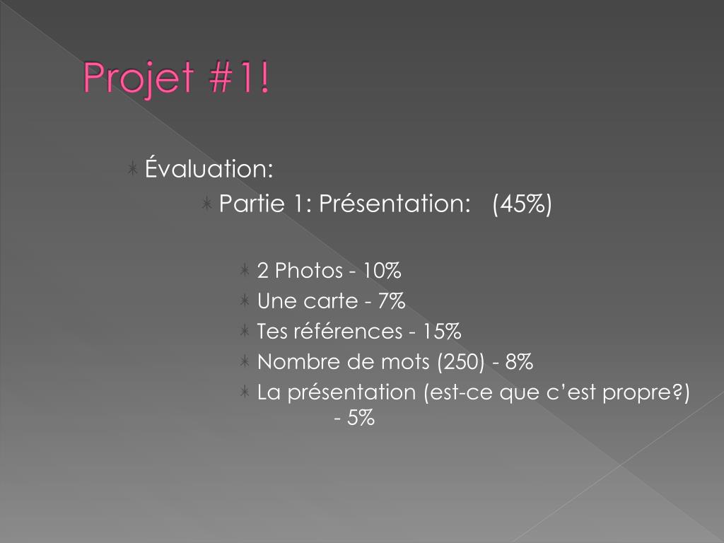 Projet #1! • Évaluation: • Partie 1: Présentation: (45%) • 2 Photos - 10% • Une carte - 7% • Tesréférences - 15% • Nombre de mots (250) - 8% • La présentation(est-cequec’estpropre?) - 5%