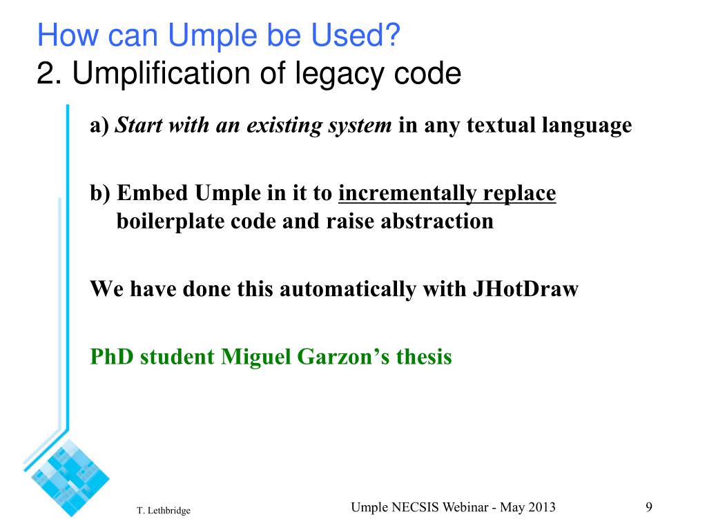 How can Umple be Used?2. Umplification of legacy code • a) Start with an existing system in any textual language • b) Embed Umple in it to incrementally replace boilerplate code and raise abstraction • We have done this automatically with JHotDraw • PhD student Miguel Garzon’s thesis Umple NECSIS Webinar - May 2013