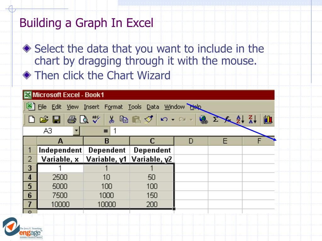 Building a Graph In Excel • Select the data that you want to include in the chart by dragging through it with the mouse. • Then click the Chart Wizard