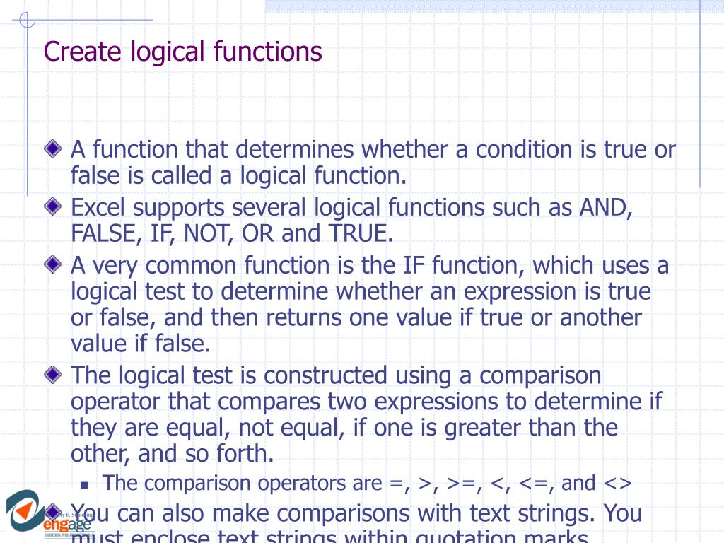 Create logical functions • A function that determines whether a condition is true or false is called a logical function. • Excel supports several logical functions such as AND, FALSE, IF, NOT, OR and TRUE. • A very common function is the IF function, which uses a logical test to determine whether an expression is true or false, and then returns one value if true or another value if false. • The logical test is constructed using a comparison operator that compares two expressions to determine if they are equal, not equal, if one is greater than the other, and so forth. • The comparison operators are =, >, >=, <, <=, and <> • You can also make comparisons with text strings. You must enclose text strings within quotation marks.