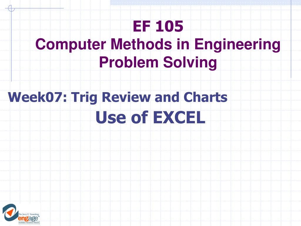 WELCOME. EF 105 Fall 2006. EF 105 Computer Methods in Engineering Problem Solving. Week07: Trig Review and Charts Use of EXCEL. Learning Objectives. Learn more about functions Learn how to use Trigonometry functions Learn to use tables and graphs as problem solving tools
