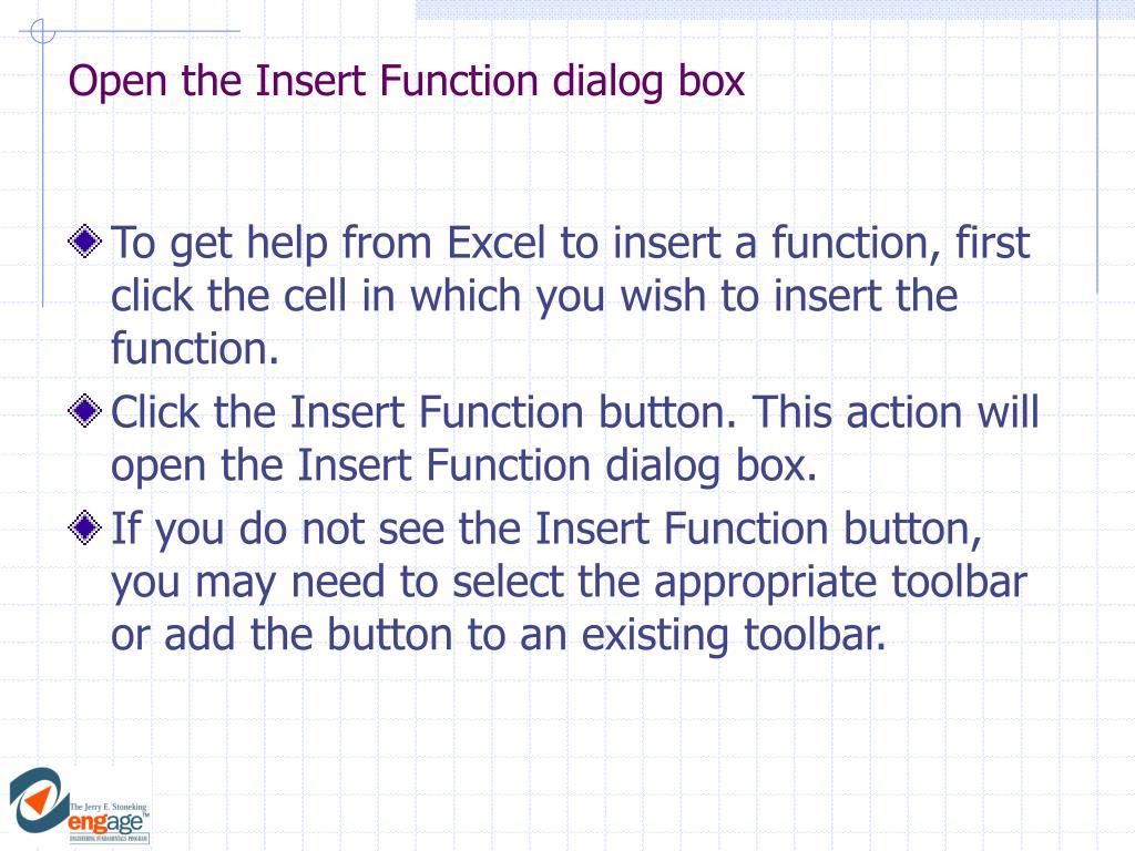 Open the Insert Function dialog box • To get help from Excel to insert a function, first click the cell in which you wish to insert the function. • Click the Insert Function button. This action will open the Insert Function dialog box. • If you do not see the Insert Function button, you may need to select the appropriate toolbar or add the button to an existing toolbar.