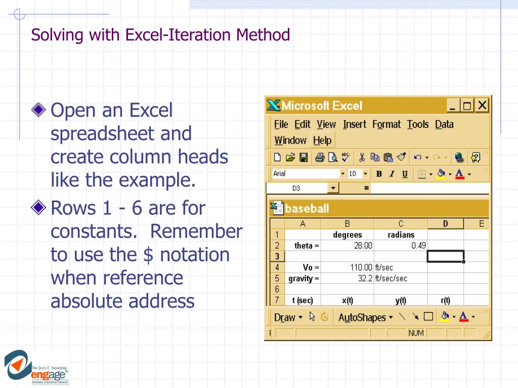 Solving with Excel-Iteration Method • Open an Excel spreadsheet and create column heads like the example. • Rows 1 - 6 are for constants. Remember to use the $ notation when reference absolute address