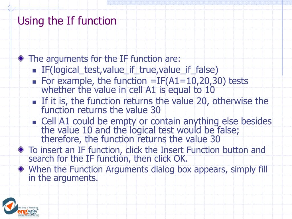 Using the If function • The arguments for the IF function are: • IF(logical_test,value_if_true,value_if_false) • For example, the function =IF(A1=10,20,30) tests whether the value in cell A1 is equal to 10 • If it is, the function returns the value 20, otherwise the function returns the value 30 • Cell A1 could be empty or contain anything else besides the value 10 and the logical test would be false; therefore, the function returns the value 30 • To insert an IF function, click the Insert Function button and search for the IF function, then click OK. • When the Function Arguments dialog box appears, simply fill in the arguments.
