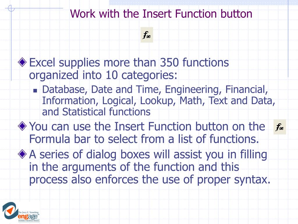 Work with the Insert Function button • Excel supplies more than 350 functions organized into 10 categories: • Database, Date and Time, Engineering, Financial, Information, Logical, Lookup, Math, Text and Data, and Statistical functions • You can use the Insert Function button on the Formula bar to select from a list of functions. • A series of dialog boxes will assist you in filling in the arguments of the function and this process also enforces the use of proper syntax.