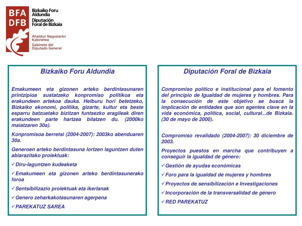 Bizkaiko Foru Aldundia Emakumeen eta gizonen arteko berdintasunaren printzipioa sustatzeko konpromiso politikoa eta erakundeen artekoa dauka. Helburu hori betetzeko, Bizkaiko ekonomi, politika, gizarte, kultur eta beste esparru batzuetako bizitzan funtsezko eragileak diren erakundeen parte hartzea bilatzen du. (2000ko maiatzaren 30a). Konpromisoa berretsi (2004-2007): 2003ko abenduaren 30a. Generoen arteko berdintasuna lortzen laguntzen duten abiarazitako proiektuak: • Diru-laguntzen kudeaketa • Emakumeen eta gizonen arteko berdintasunerako foroa • Sentsibilizazio proiektuak eta ikerlanak • Genero zeharkakotasunaren agerpena • PAREKATUZ SAREA Diputación Foral de Bizkaia Compromiso político e institucional para el fomento del principio de Igualdad de mujeres y hombres. Para la consecución de este objetivo se busca la implicación de entidades que son agentes clave en la vida económica, política, social, cultural...de Bizkaia. (30 de mayo de 2000). Compromiso revalidado(2004-2007): 30 diciembre de 2003. Proyectos puestos en marcha que contribuyen a conseguir la igualdad de género: • Gestión de ayudas económicas • Foro para la igualdad de mujeres y hombres • Proyectos de sensibilización e Investigaciones • Incorporación de la transversalidad de género • RED PAREKATUZ