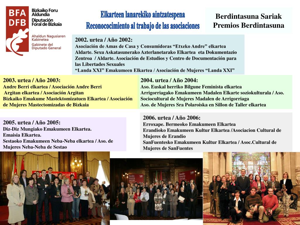 Berdintasuna Sariak Premios Berdintasuna Elkarteen lanarekiko aintzatespena Reconococimiento al trabajo de las asociaciones 2002. urtea / Año 2002: Asociación de Amas de Casa y Consumidoras “Etxeko Andre” elkartea Aldarte. Sexu Askatasunerako Azterlanetarako Elkartea eta Dokumentazio Zentroa / Aldarte. Asociación de Estudios y Centro de Documentación para las Libertades Sexuales“Landa XXI” Emakumeen Elkartea / Asociación de Mujeres “Landa XXI” 2003. urtea / Año 2003: Andre Berri elkartea / Asociación Andre Berri Argitan elkartea / Asociación ArgitanBizkaiko Emakume Mastektomizatuen Elkartea / Asociación de Mujeres Mastectomizadas de Bizkaia 2004. urtea / Año 2004: Aso. Euskal herriko Bilgune Feminista elkarteaArrigorriagako Emakumeen Madalen Elkarte soziokulturala / Aso. Sociocultural de Mujeres Madalen de Arrigorriaga Aso. de Mujeres Sra Polaroiska en Sillon de Taller elkartea 2006. urtea / Año 2006: Erroxape. Bermeoko Emakumeen Elkartea Erandioko Emakumeen Kultur Elkartea /Asociacion Cultural de Mujeres de Erandio SanFuentesko Emakumeen Kultur Elkartea / Asoc.Cultural de Mujeres de SanFuentes 2005. urtea / Año 2005: Diz-Diz Mungiako Emakumeen Elkartea. Emaisia Elkartea. Sestaoko Emakumeen Neba-Neba elkartea / Aso. de Mujeres Neba-Neba de Sestao