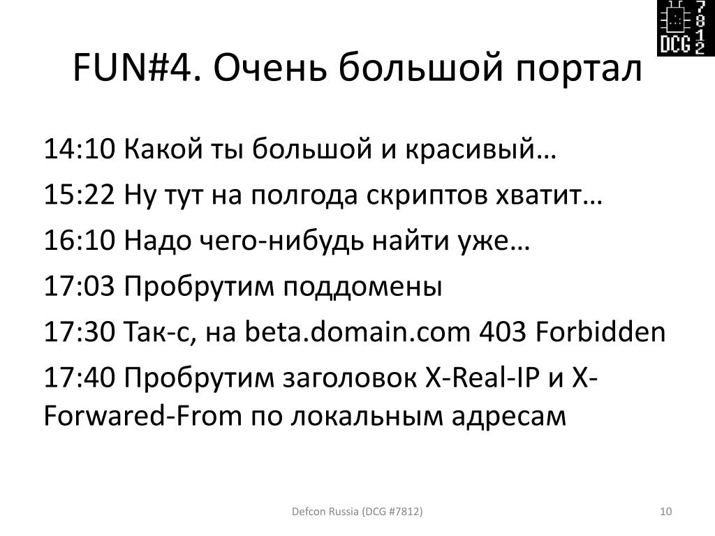 FUN#4. Очень большой портал 14:10 Какой ты большой и красивый… 15:22 Ну тут на полгода скриптов хватит… 16:10 Надо чего-нибудь найти уже… 17:03 Пробрутимподдомены 17:30 Так-c, на beta.domain.com403 Forbidden 17:40 Пробрутим заголовок X-Real-IP и X-Forwared-From по локальным адресам Defcon Russia (DCG #7812)