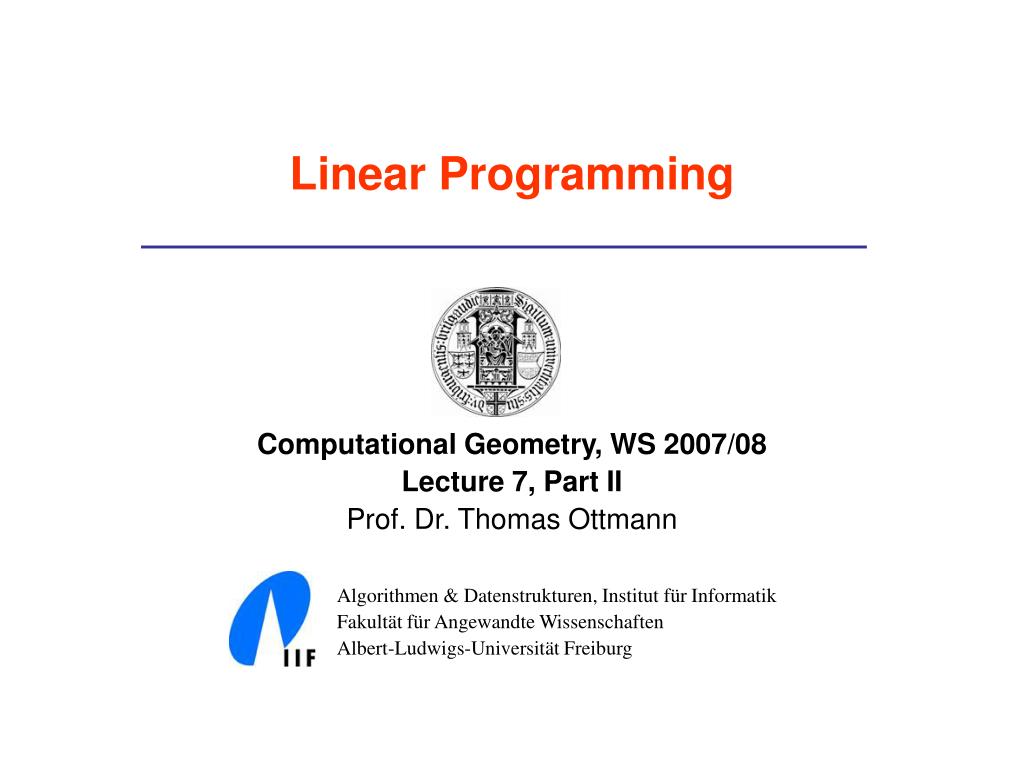 Linear Programming Computational Geometry, WS 2007/08 Lecture 7, Part II Prof. Dr. Thomas Ottmann Algorithmen & Datenstrukturen, Institut für Informatik Fakultät für Angewandte Wissenschaften Albert-Ludwigs-Universität Freiburg