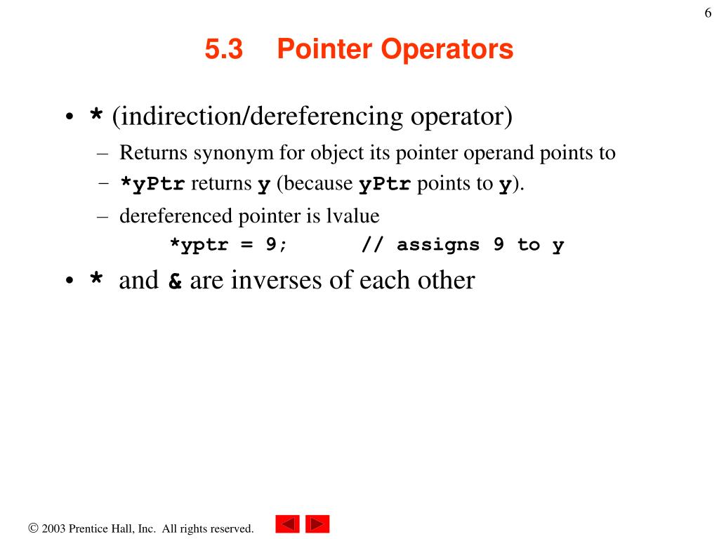 5.3 Pointer Operators • * (indirection/dereferencing operator) • Returns synonym for object its pointer operand points to • *yPtr returns y (because yPtr points to y). • dereferenced pointer is lvalue *yptr = 9; // assigns 9 to y • * and & are inverses of each other