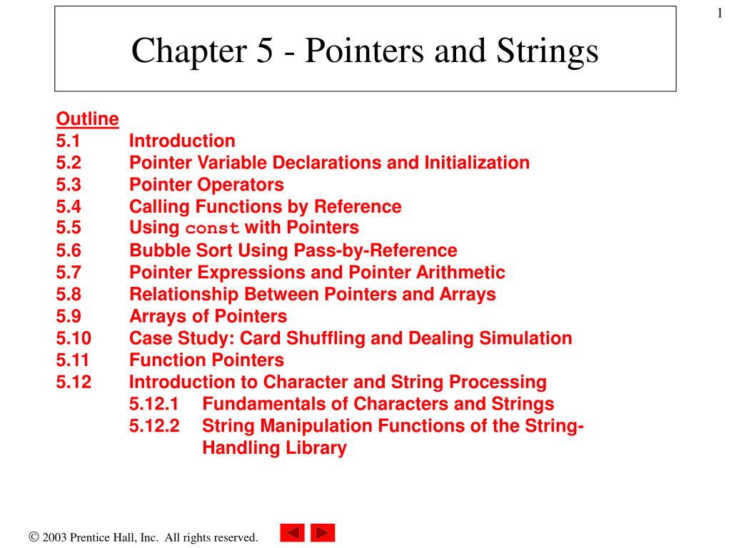 Chapter 5 - Pointers and Strings Outline5.1 Introduction5.2 Pointer Variable Declarations and Initialization5.3 Pointer Operators5.4 Calling Functions by Reference5.5 Using const with Pointers5.6 Bubble Sort Using Pass-by-Reference5.7 Pointer Expressions and Pointer Arithmetic5.8 Relationship Between Pointers and Arrays5.9 Arrays of Pointers5.10 Case Study: Card Shuffling and Dealing Simulation5.11 Function Pointers5.12 Introduction to Character and String Processing 5.12.1 Fundamentals of Characters and Strings 5.12.2 String Manipulation Functions of the String- Handling Library