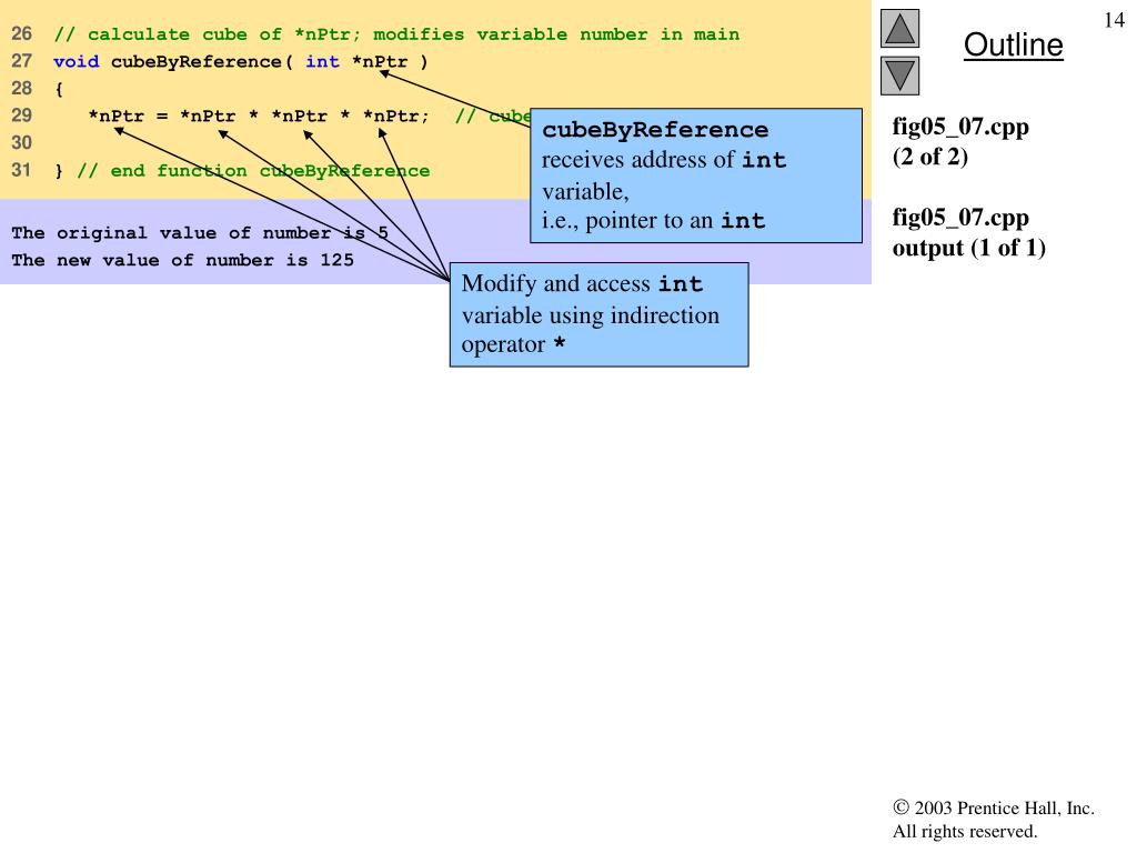 1 // Fig. 5.7: fig05_07.cpp 2 // Cube a variable using pass-by-reference 3 // with a pointer argument. 4 #include <iostream> 5 6 using std::cout; 7 using std::endl; 8 9 void cubeByReference( int * ); // prototype 10 11 int main() 12 { 13 int number = 5; 14 15 cout << "The original value of number is " << number; 16 17 // pass address of number to cubeByReference 18 cubeByReference( &number ); 19 20 cout << "\nThe new value of number is " << number << endl; 21 22 return0; // indicates successful termination 23 24 } // end main 25 Prototype indicates parameter is pointer to int Apply address operator & to pass address of number to cubeByReference cubeByReference modified variable number fig05_07.cpp(1 of 2)
