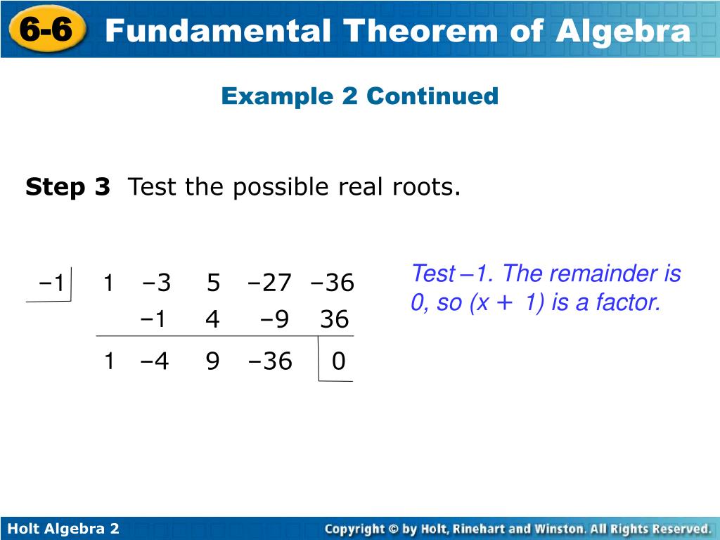 Example 2 Continued Step 3 Test the possible real roots. Test –1. The remainder is 0, so (x + 1) is a factor. –1 1 –3 5 –27 –36 –1 4 –9 36 1 –4 9 –36 0