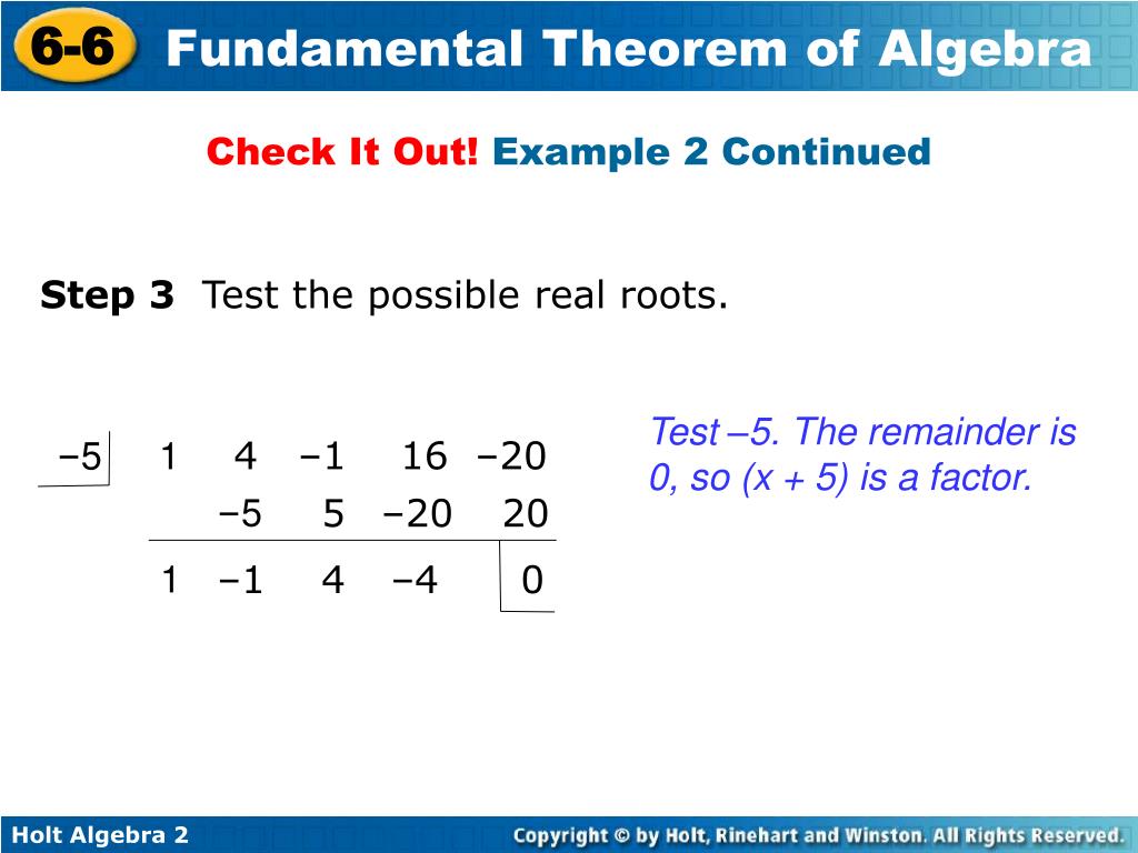 Check It Out! Example 2 Continued Step 3 Test the possible real roots. Test –5. The remainder is 0, so (x + 5) is a factor. –5 1 4 –1 16 –20 –5 5 –20 20 1 –1 4 –4 0