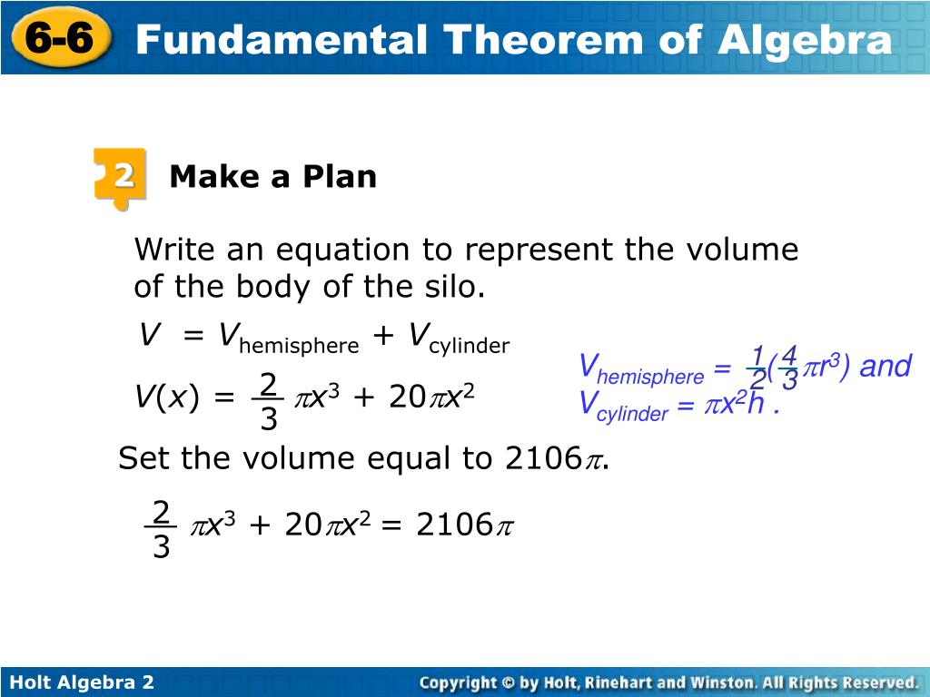 3 Solve The graph indicates a positive root of 6. Use synthetic division to verify that 6 is a root, and write the equation as (x – 6)( x2 + 23x + 138) = 0. The radius must be a positive number, so the radius of the silo is 6 feet. 1 1 1 1 1 2 2 2 2 2 6 20 0 –828 x3 + 20x2 – 828 = 0 x3 + 20x2 – 828 = 0 Write in standard form. Divide both sides by . 3 138 828 23 138 0