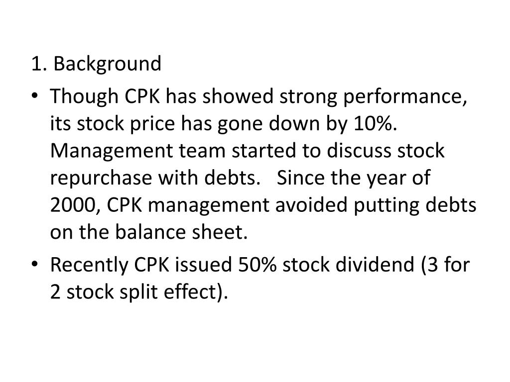 1. Background • Though CPK has showed strong performance, its stock price has gone down by 10%. Management team started to discuss stock repurchase with debts. Since the year of 2000, CPK management avoided putting debts on the balance sheet. • Recently CPK issued 50% stock dividend (3 for 2 stock split effect).