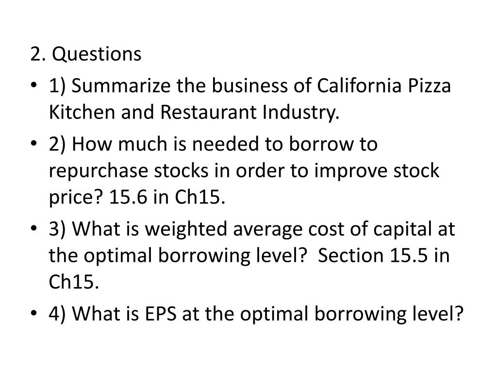 2. Questions • 1) Summarize the business of California Pizza Kitchen and Restaurant Industry. • 2) How much is needed to borrow to repurchase stocks in order to improve stock price? 15.6 in Ch15. • 3) What is weighted average cost of capital at the optimal borrowing level? Section 15.5 in Ch15. • 4) What is EPS at the optimal borrowing level?