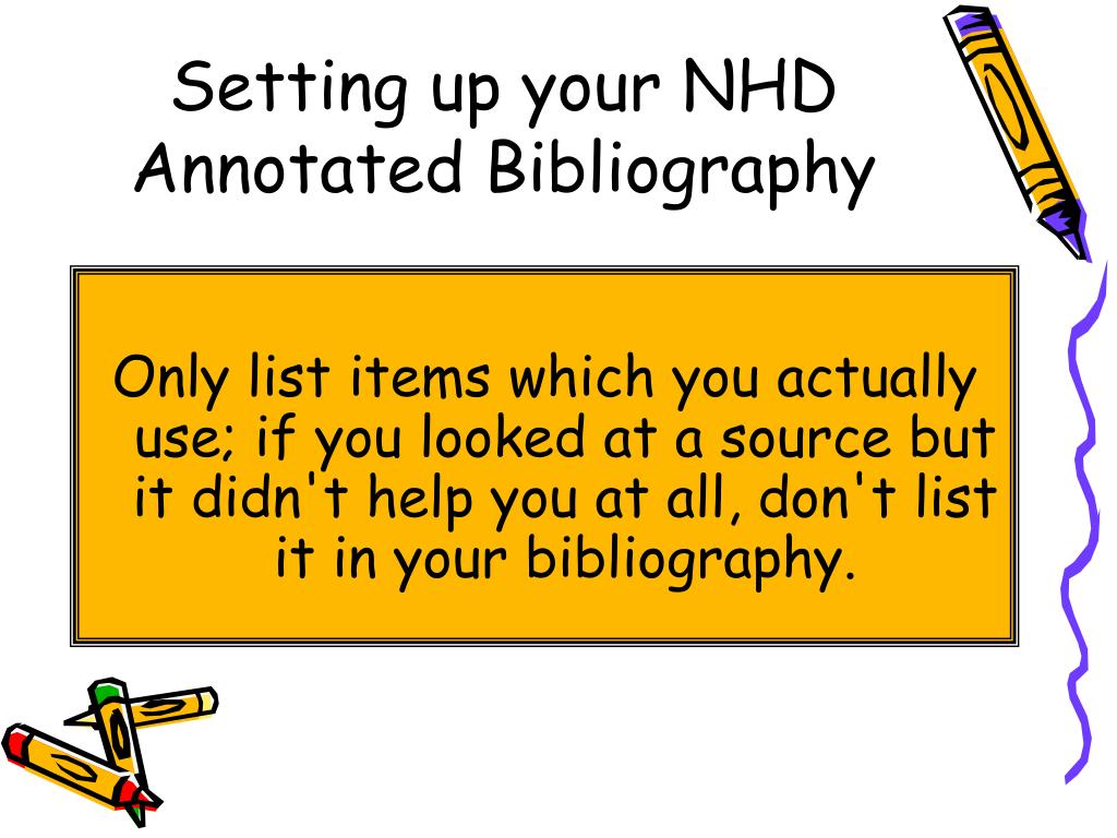 Setting up your NHD Annotated Bibliography Only list items which you actually use; if you looked at a source but it didn't help you at all, don't list it in your bibliography.