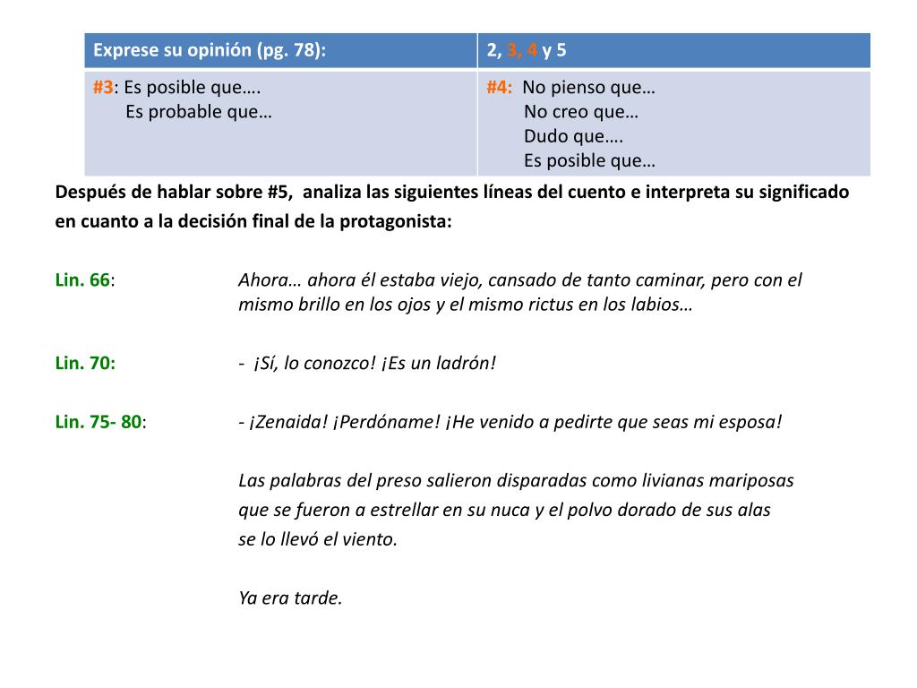 Después de hablarsobre #5, analizalassiguienteslíneas del cuento e interpretasusignificado en cuanto a la decisión final de la protagonista: Lin. 66: Ahora… ahoraélestabaviejo, cansado de tantocaminar, pero con el mismobrillo en los ojos y el mismo rictus en los labios… Lin. 70: - ¡Sí, lo conozco! ¡Es un ladrón! Lin. 75- 80: - ¡Zenaida! ¡Perdóname! ¡He venido a pedirteque seas mi esposa! Las palabras del presosalierondisparadascomolivianas mariposas que se fueron a estrellar en sunucay el polvo dorado de sus alas se lo llevó el viento. Ya era tarde.