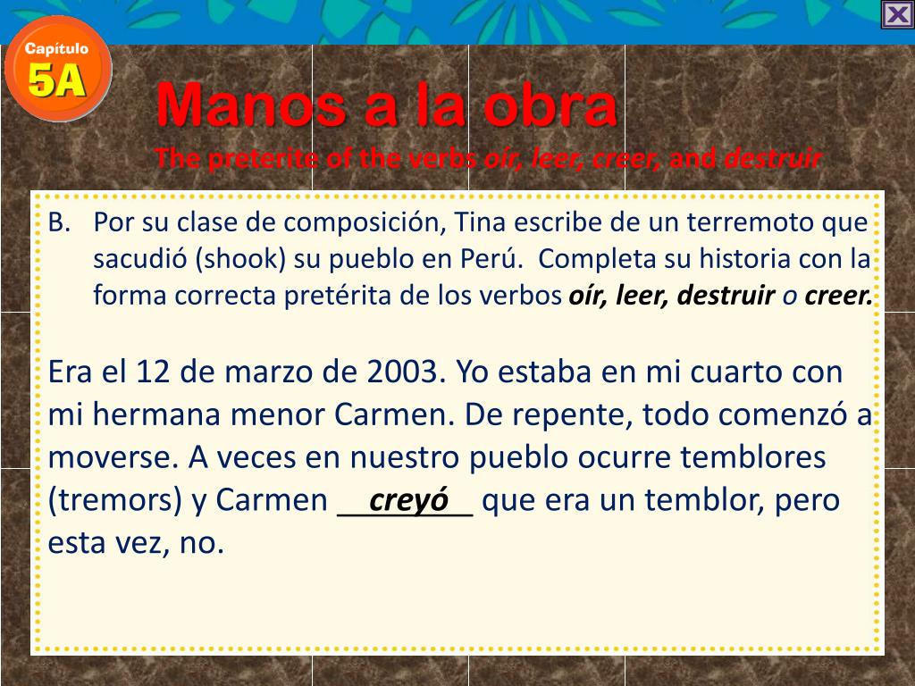 Manos a la obra The preterite of the verbs oír, leer, creer, and destruir • oír, leer, destruir ocreer. • Era el 12 de marzo de 2003. Yo estaba en mi cuarto con mi hermana menor Carmen. De repente, todo comenzó a moverse. A veces en nuestro pueblo ocurre temblores (tremors) y Carmen creyó que era un temblor, pero esta vez, no. ¡Era un terremoto! Carmen y yo teníamos mucho miedo. Yo traté de hacer algo y Carmen creyó que esconderse era una buena idea. Afortunadamente, nosotras a mi mamá que nos llamaba.