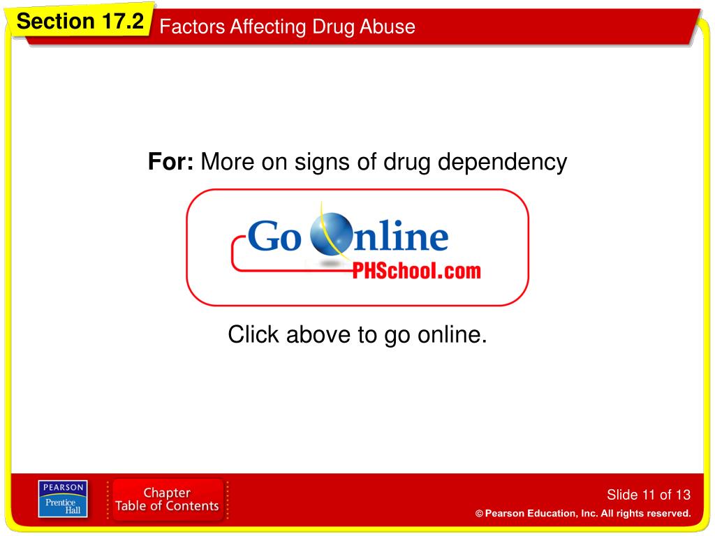 Section 17.2. Factors Affecting Drug Abuse. Objective. Evaluate how family, friends, and personal factors can influence an individual’s decisions about drugs. Quick Quiz See how many of these questions you can answer “yes” to. Do you avoid situations where you think drugs might be used?.
