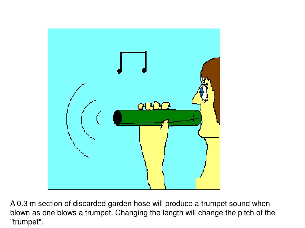 A 0.3 m section of discarded garden hose will produce a trumpet sound when blown as one blows a trumpet. Changing the length will change the pitch of the "trumpet".