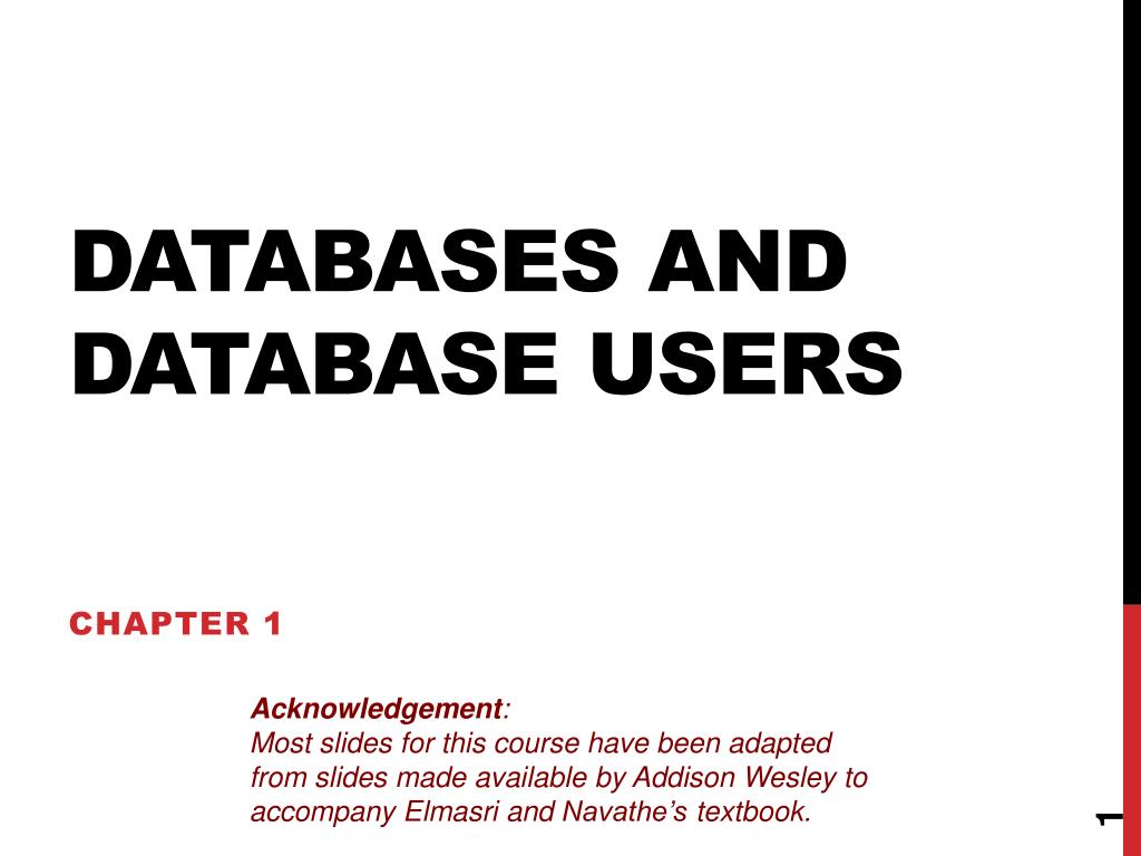 Databases and Database Users Chapter 1 Acknowledgement: Most slides for this course have been adapted from slides made available by Addison Wesley to accompany Elmasri and Navathe’s textbook.