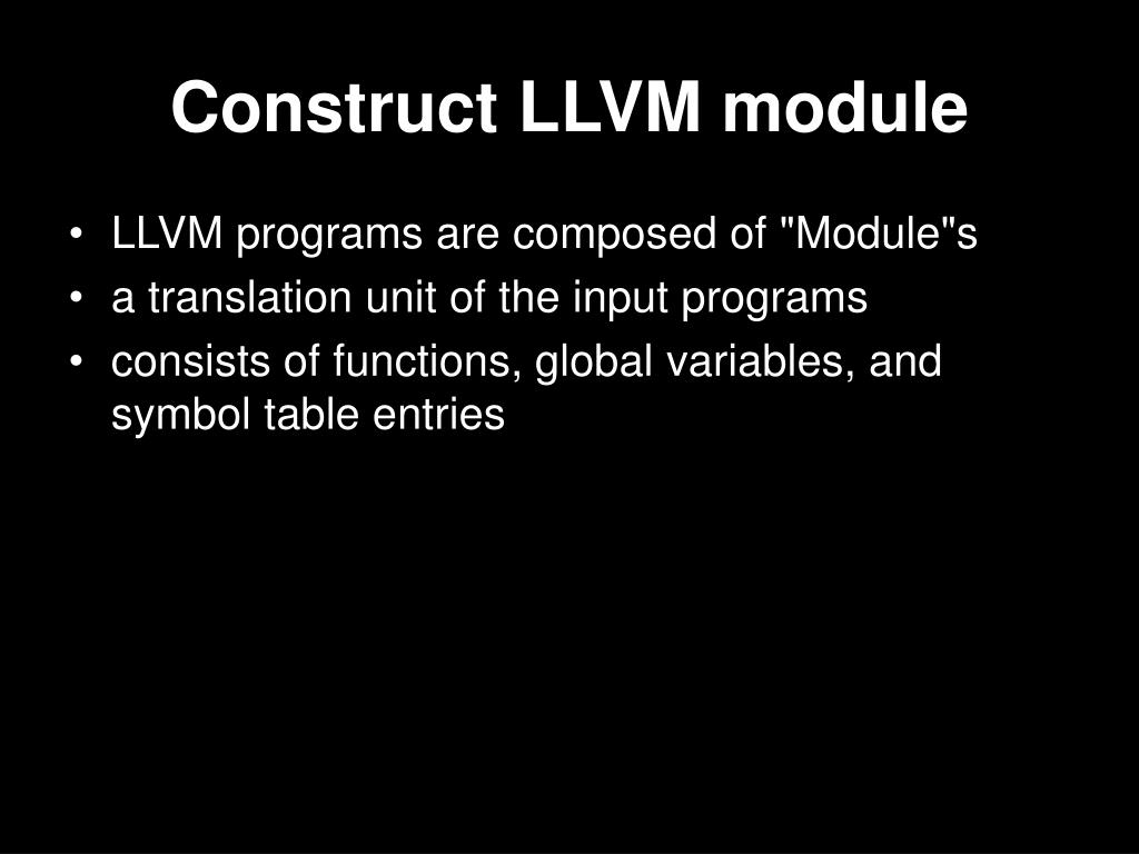Construct LLVM module • LLVM programs are composed of "Module"s • a translation unit of the input programs • consists of functions, global variables, and symbol table entries