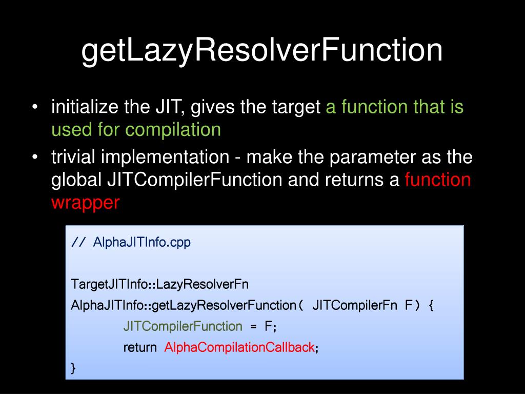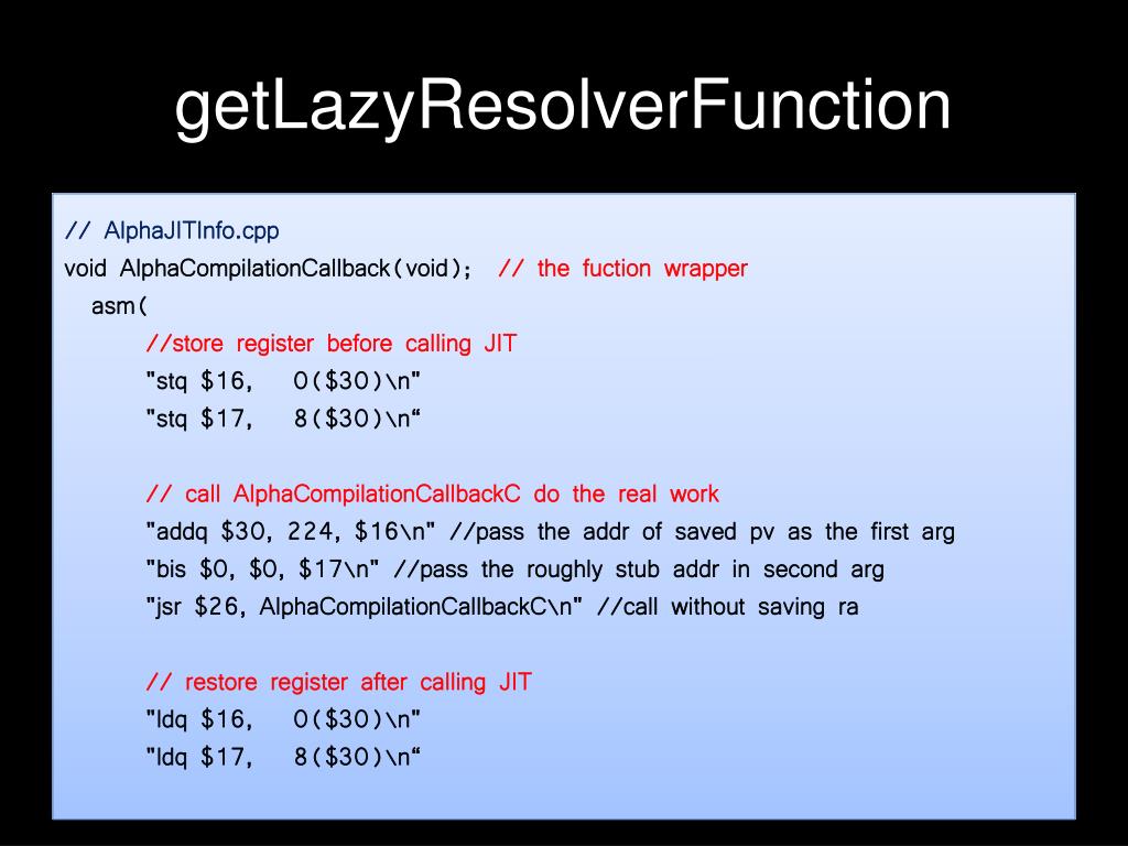 getLazyResolverFunction // AlphaJITInfo.cpp void AlphaCompilationCallback(void); // the fuction wrapper asm( //store register before calling JIT "stq $16, 0($30)\n" "stq $17, 8($30)\n“ // call AlphaCompilationCallbackC do the real work "addq $30, 224, $16\n" //pass the addr of saved pv as the first arg "bis $0, $0, $17\n" //pass the roughly stub addr in second arg "jsr $26, AlphaCompilationCallbackC\n" //call without saving ra // restore register after calling JIT "ldq $16, 0($30)\n" "ldq $17, 8($30)\n“